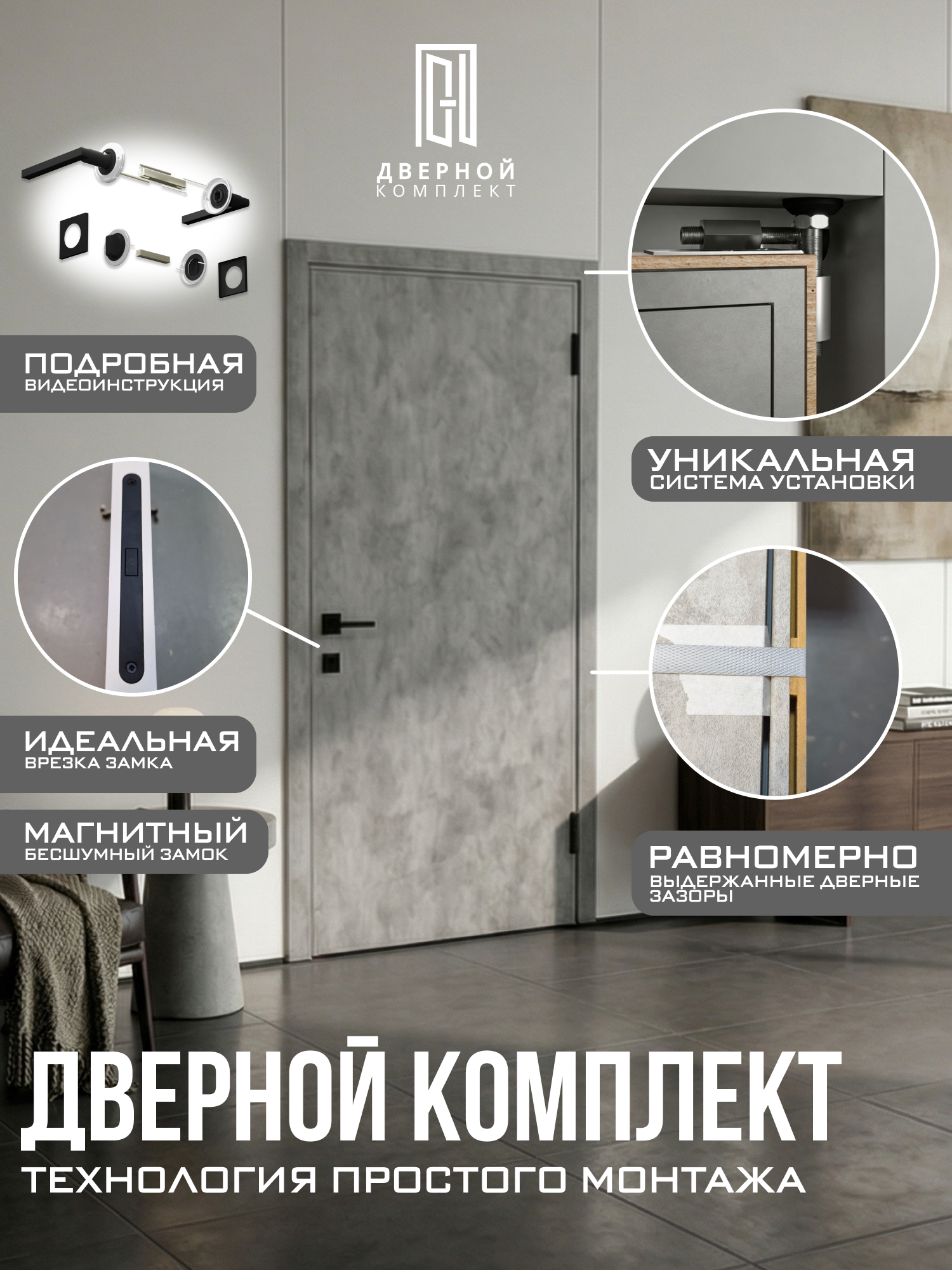 Простота установки осуществляется за счёт полной подготовки и сборки межкомнатной двери в готовый блок и уникальной технологии фиксации в дверном проёме, с помощью кронштейнов собственной разработки. В комплекте поставляются все необходимые комплектующие и инструмент